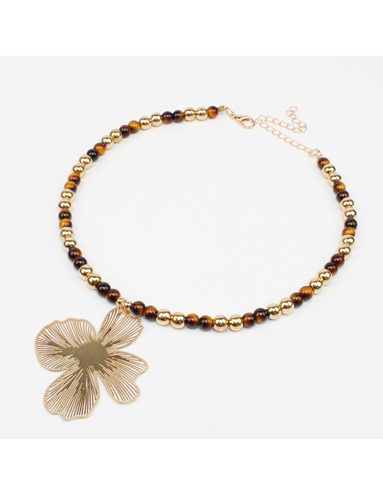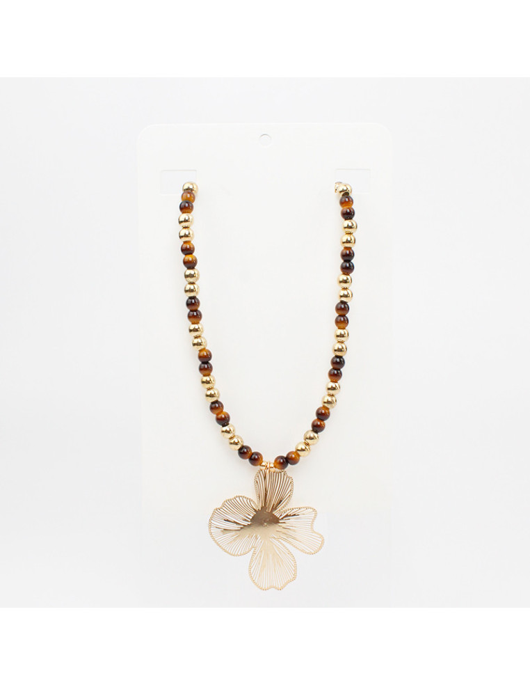 Collar de flexible de lenga con bolitas de vidrio y CCB intervenido con dije de chapa en forma de flor.