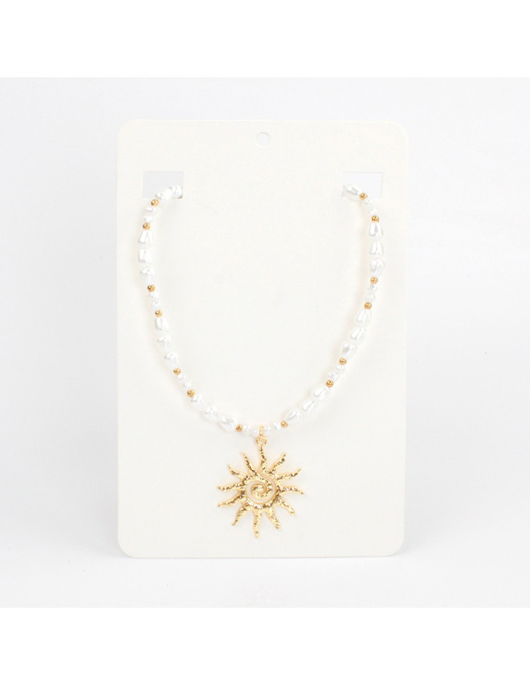 Collar flexible de lenga con perlas símil río de dos tamaños, separadores de CCB y dije veraniego con forma de sol.