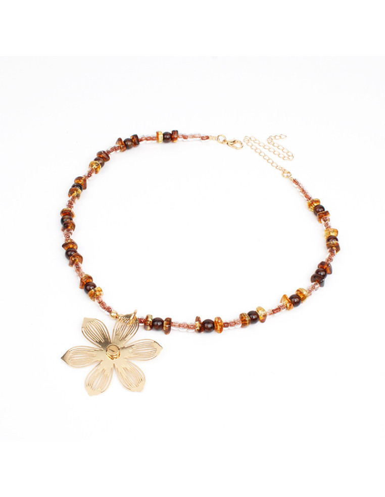 Collar flexible de lenga con bolitas de vidrio, escallas de acrílico y dije exclusivo de chapa con forma de flor.
