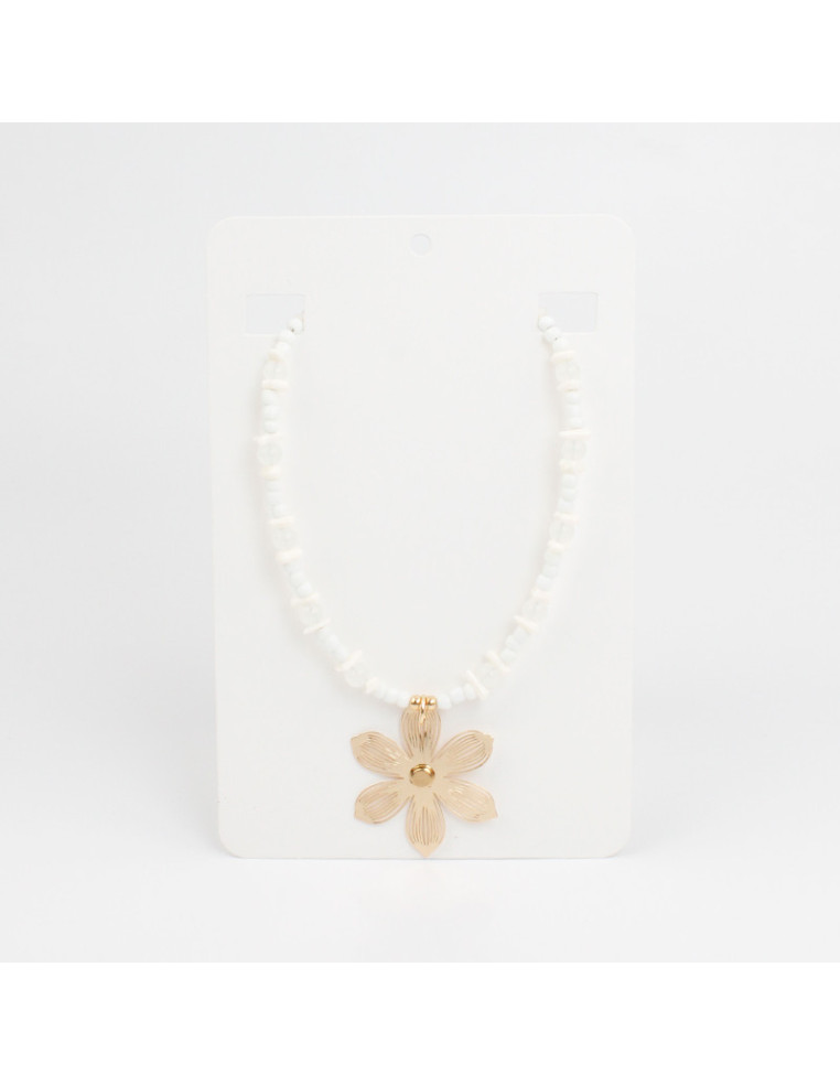 Collar flexible de lenga con bolitas de vidrio, escallas de acrílico y dije exclusivo de chapa con forma de flor.