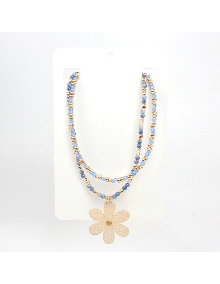 Collar flexible doble, de bolitas de vidrio marmoladas, con mostacillas, separadores de CCB y dije de flor filigrana.