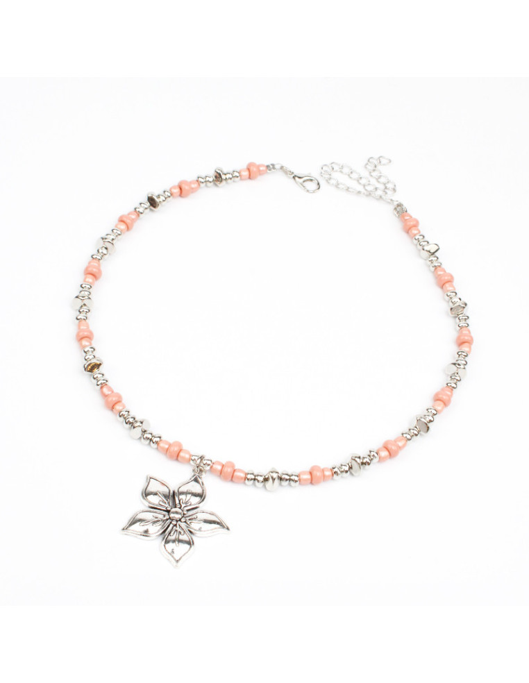 Collar flexible de lenga, con mostacillas, cuentas de vidrio, separadores de CCB y dije de fundición con forma de flor.