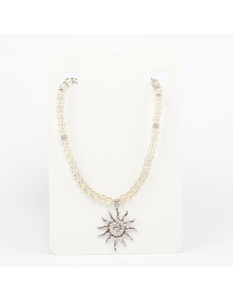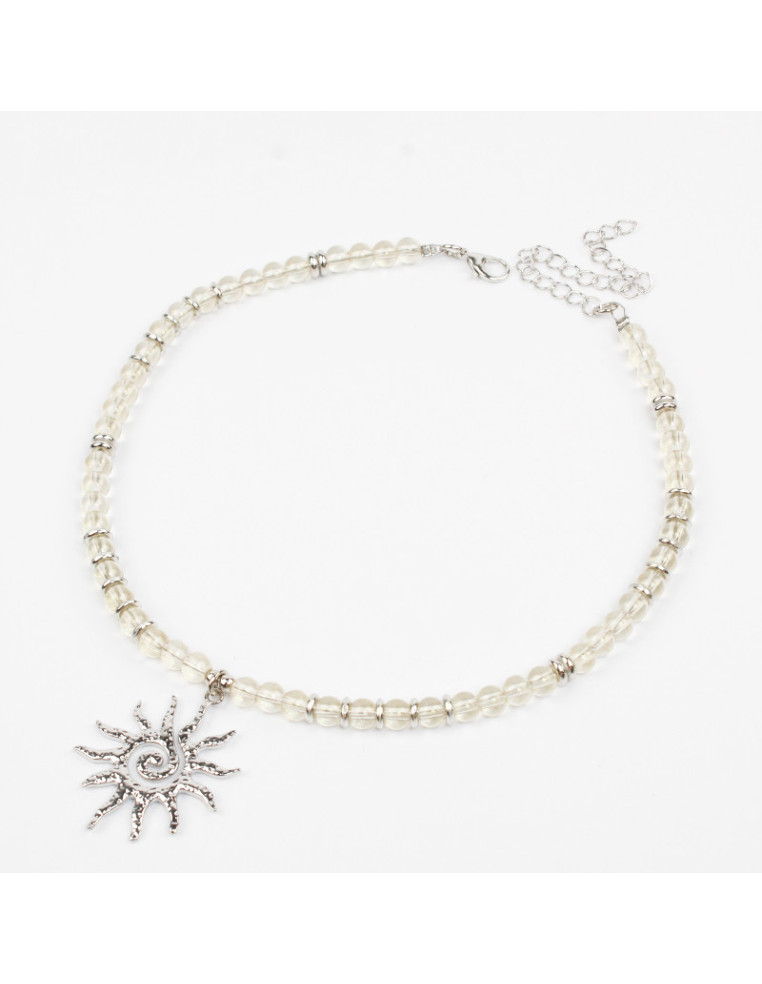 Collar flexible de lenga, con bolitas de vidrio, pasantes de CCB y dije de fundición con forma de sol.