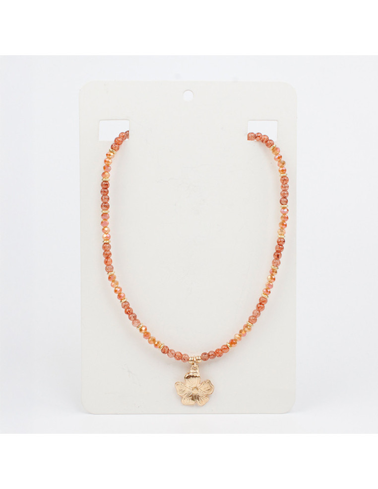 Collar flexible de lenga, con bolitas de vidrio, rocas de cristal, pasantes de CCB y dije de fundición con forma de flor.