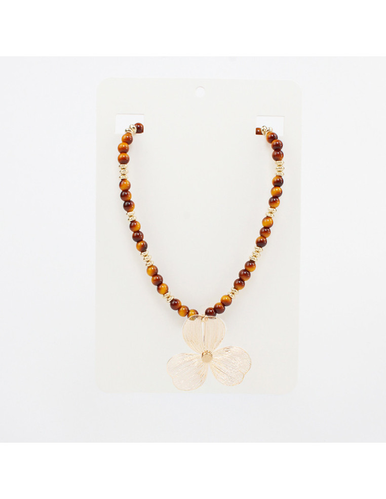 Collar flexible de lenga con bolitas de vidrio, pasantes de CCB y dije de metal con forma de flor filigrana.
