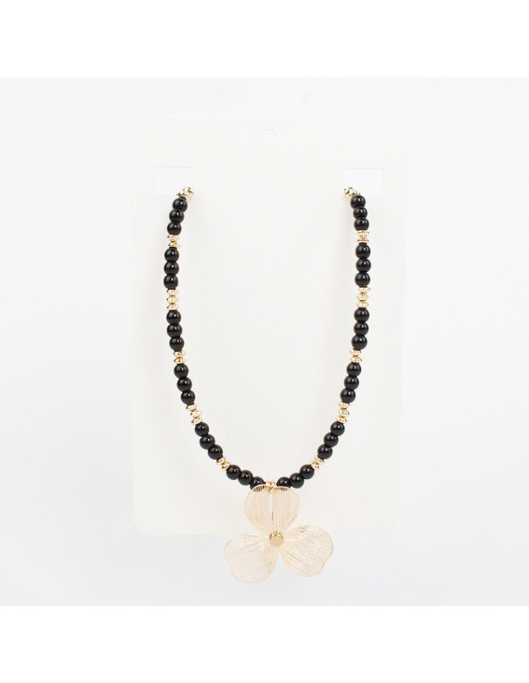 Collar flexible de lenga con bolitas de vidrio, pasantes de CCB y dije de metal con forma de flor filigrana.