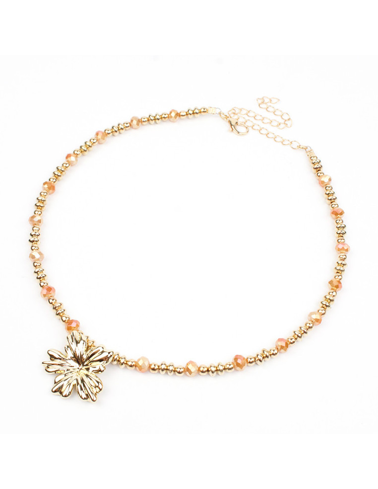 Collar flexible de lenga, con rocas de cristal, pasantes de CCB dorado y dije de CCB con forma de flor.
