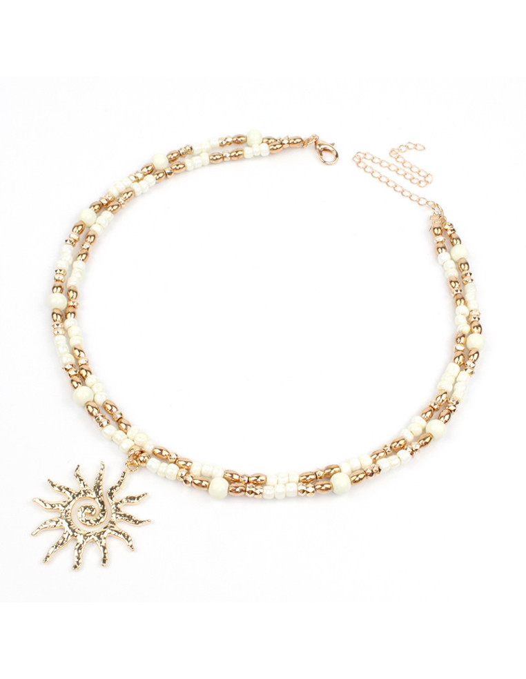 Collar flexible de lenga, con mostacillas, bolitas de vidrio, pasantes de CCB y dije de fundición con forma de sol.