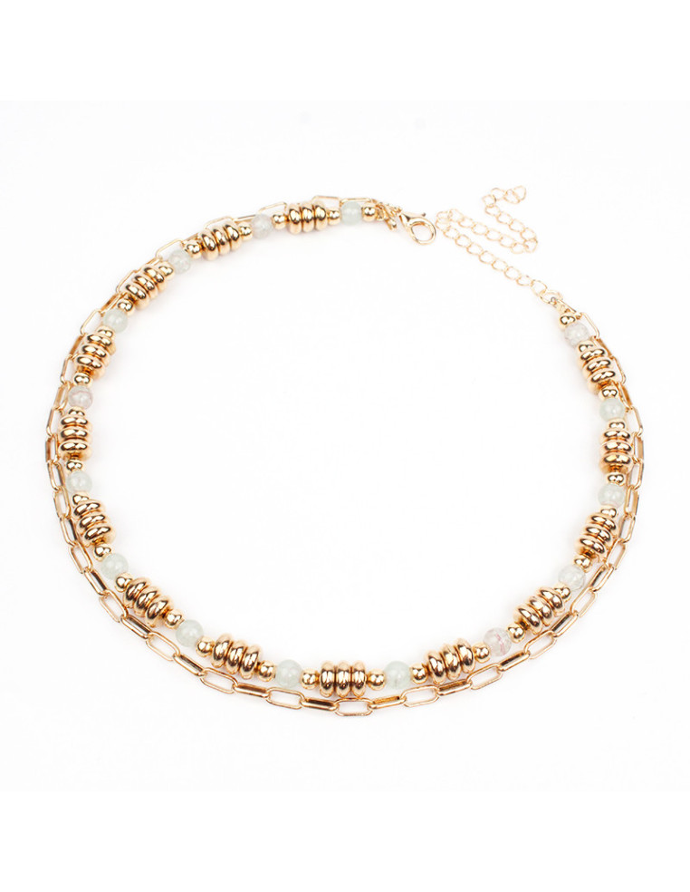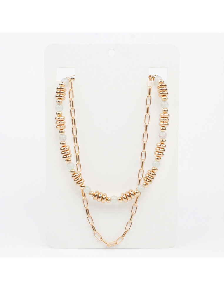 Collar de cadenas combinado con lenga, con bolitas de vidrio y pasantes de CCB. Medidas: 37cm y 41cm de largo, ajustable con cadena de enganche de 10cm.
