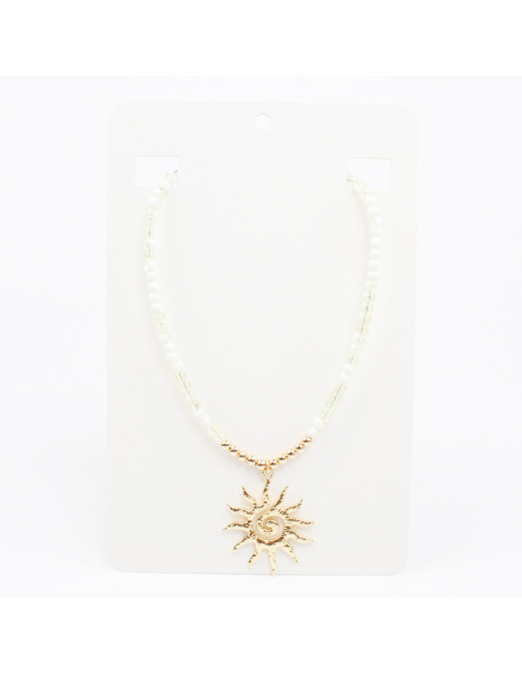 Collar flexible de lenga, con bolitas de vidrio bicolor, pasantes de CCB y dije de fundición con forma de sol.