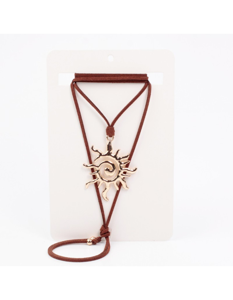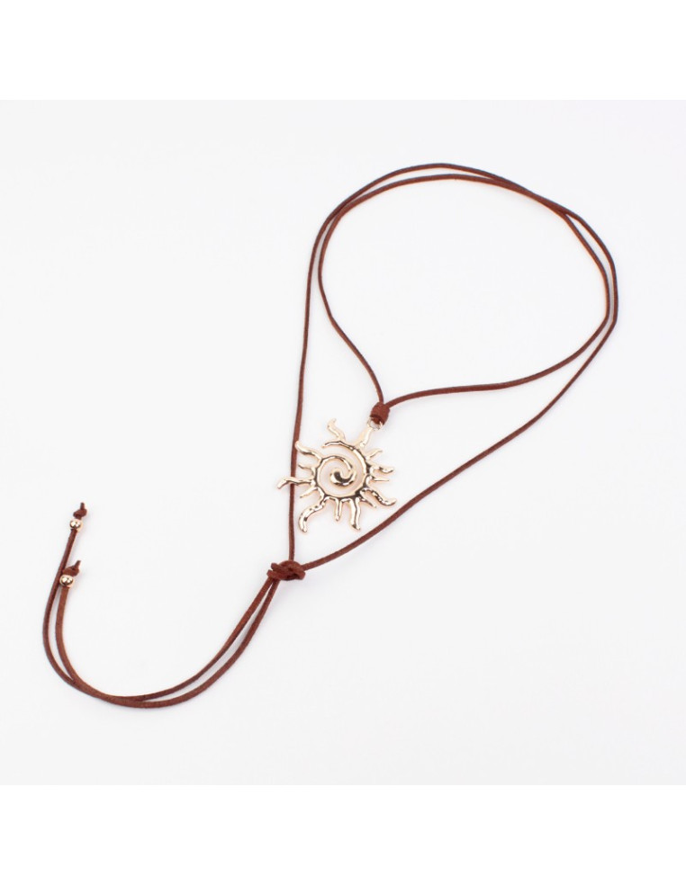 Collar de gamuza de múltiples vueltas, con dije exclusivo de fundición con forma sol playero y terminales en punteras.