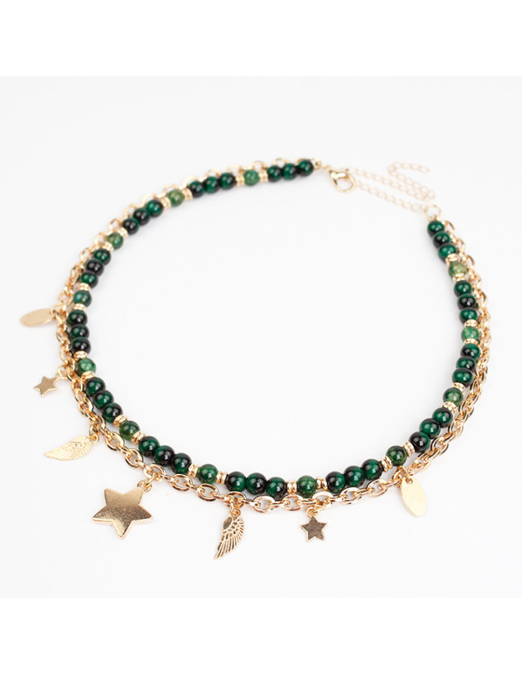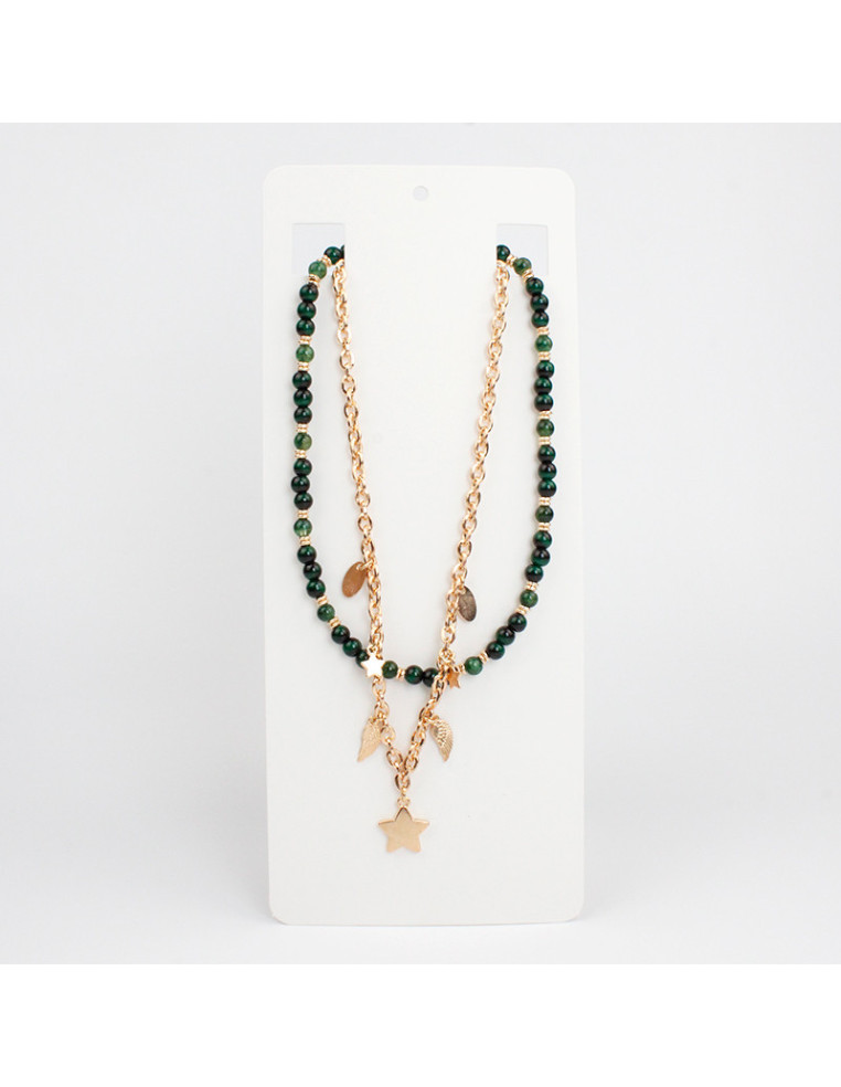 Collar multicharms de cadena, con dijes de fundición dorados, combinado con collar flexible de lenga con bolitas de vidrio.Medidas: 37cm y 38cm de largo, ajustable con cadena de enganche de 10cm.