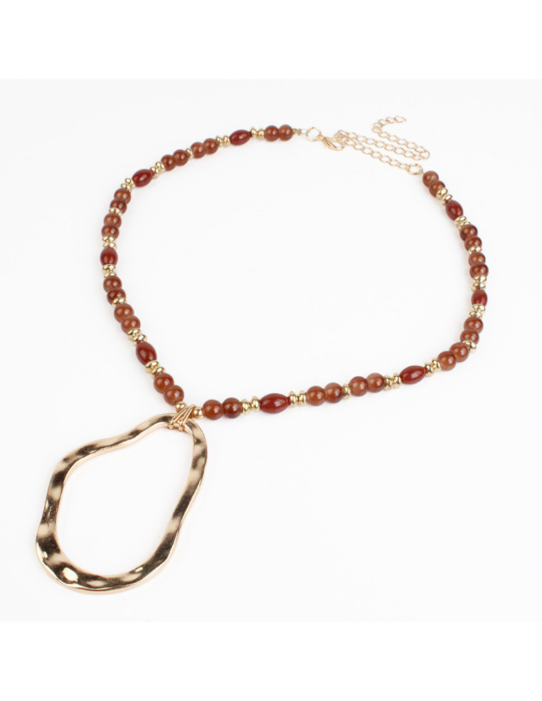 Collar de tanza de acero enhebrado con bolitas de vidrio, combinado con pasantes de CCB dorados y dije orgánico de fundición. Medidas: 38cm de largo, ajustable con cadena de enganche de 10cm.