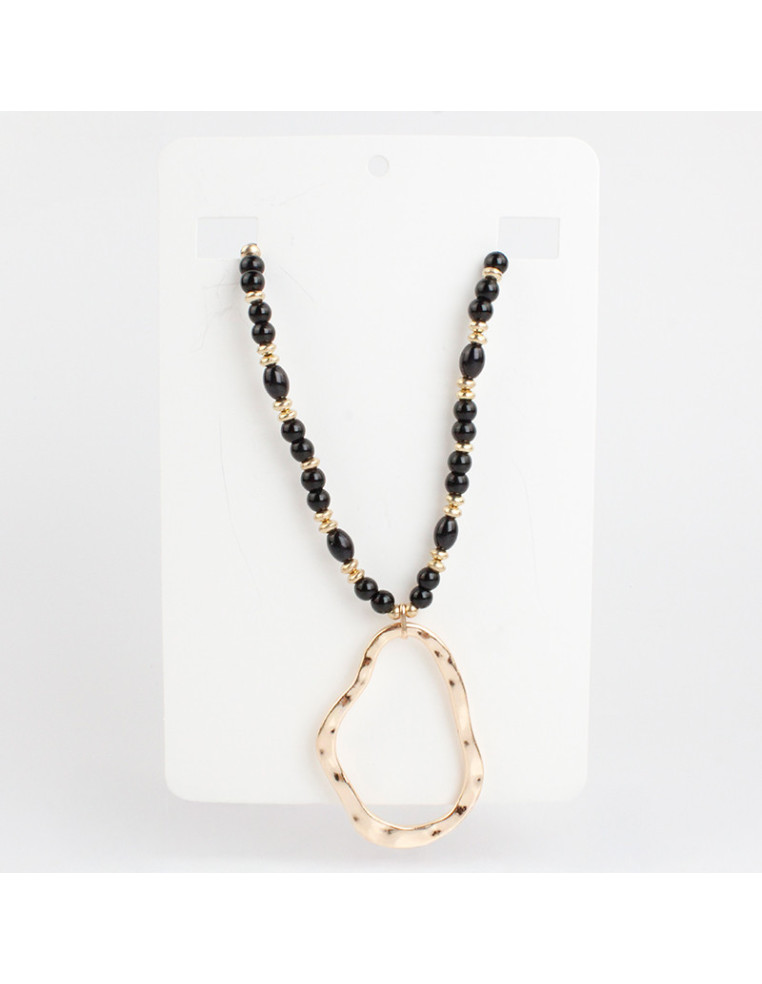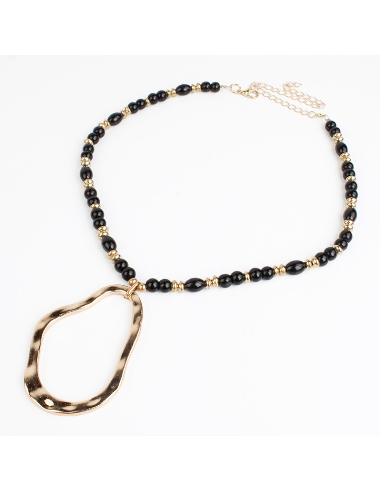 Collar de tanza de acero enhebrado con bolitas de vidrio, combinado con pasantes de CCB dorados y dije orgánico de fundición.