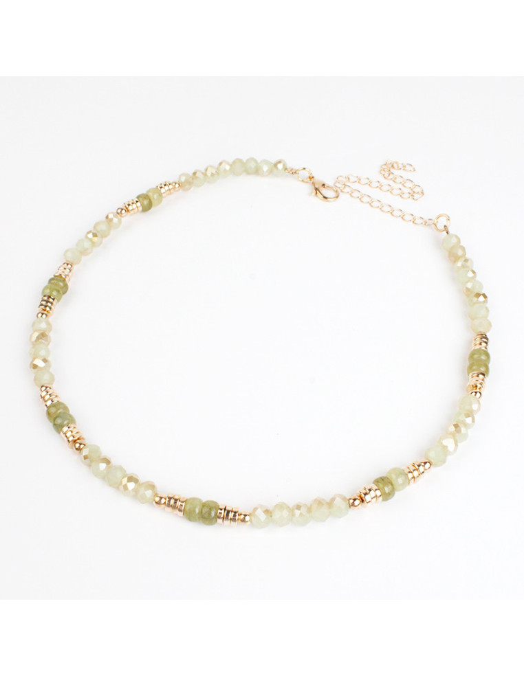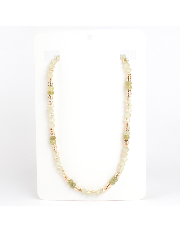 Collar de tanza de acero, enhebrada con rocas de cristal, combinadas con cuentas de vidrio y piezas pasantes de CCB doradas.