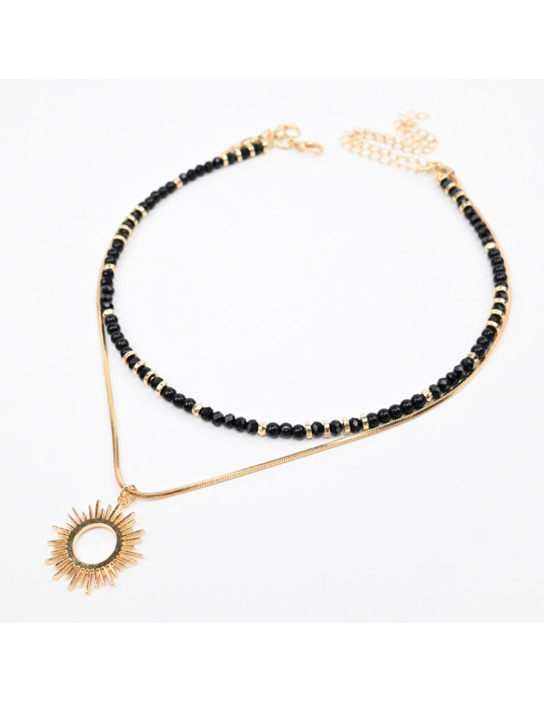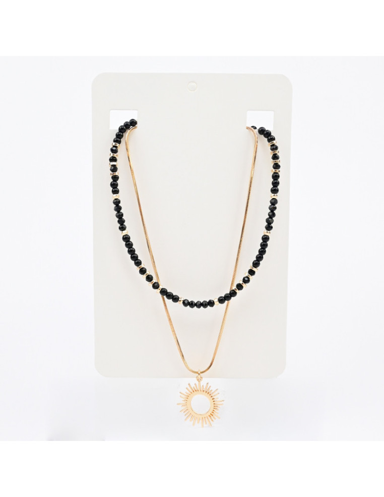 Set de dos collares, uno de cadena con dije de fundición, otro de lenga enhebrado con bolitas de vidrio combinadas con roca de cristal y pasantes de CCB.
