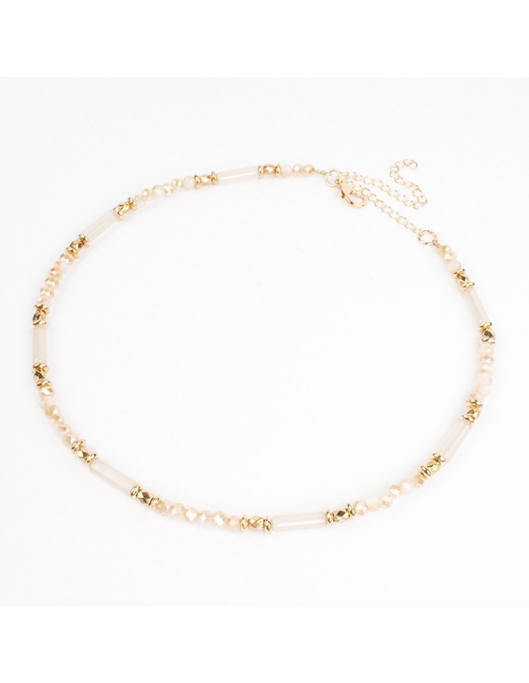 Collar de tanza de acero con rocas de cristal, piezas de acrílico marmoladas y pasantes de CCB dorados.