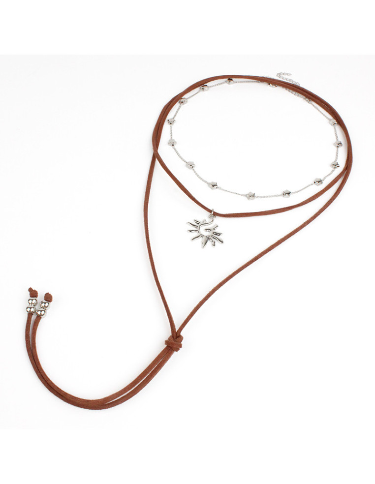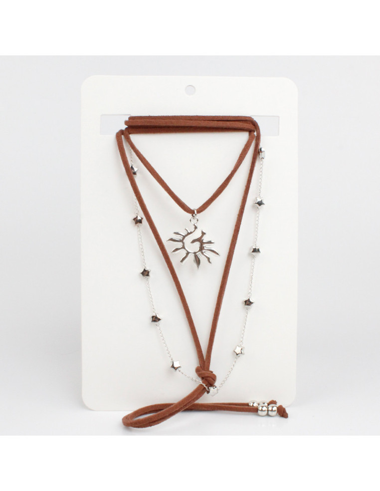 Set de dos collares, uno de gamuza con dije de fundición con forma de sol, otro de cadena de eslabones con forma de estrella.