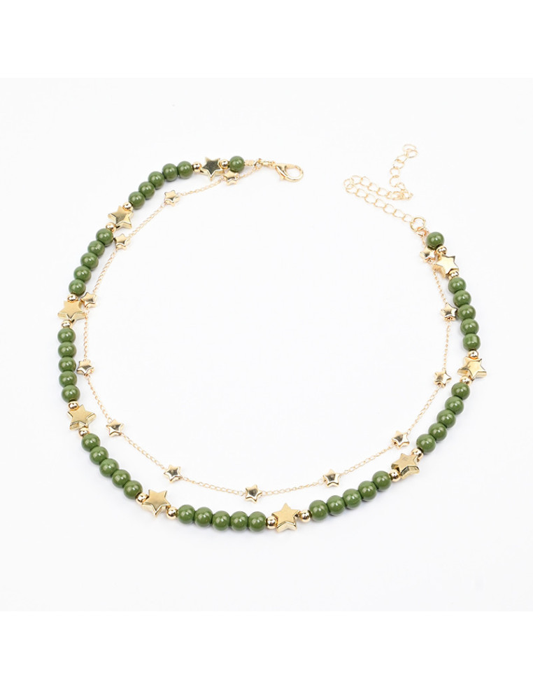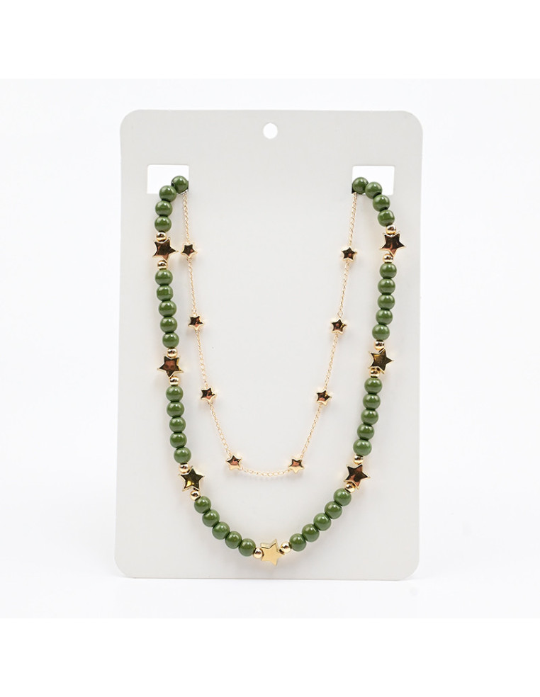 Collar de cadena de eslabones con forma de estrellas combinado con collar de tanza enhebrado con bolitas de vidrio y dijes pasantes.