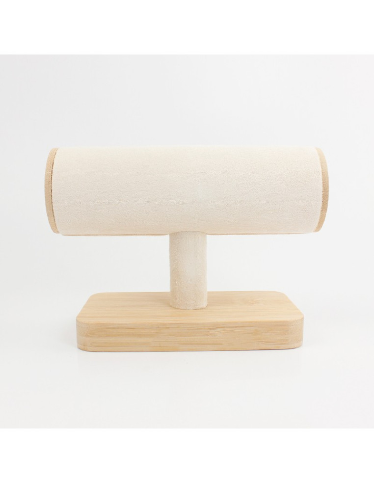 Exhibidor de pulseras con base de madera y brazo de tela.