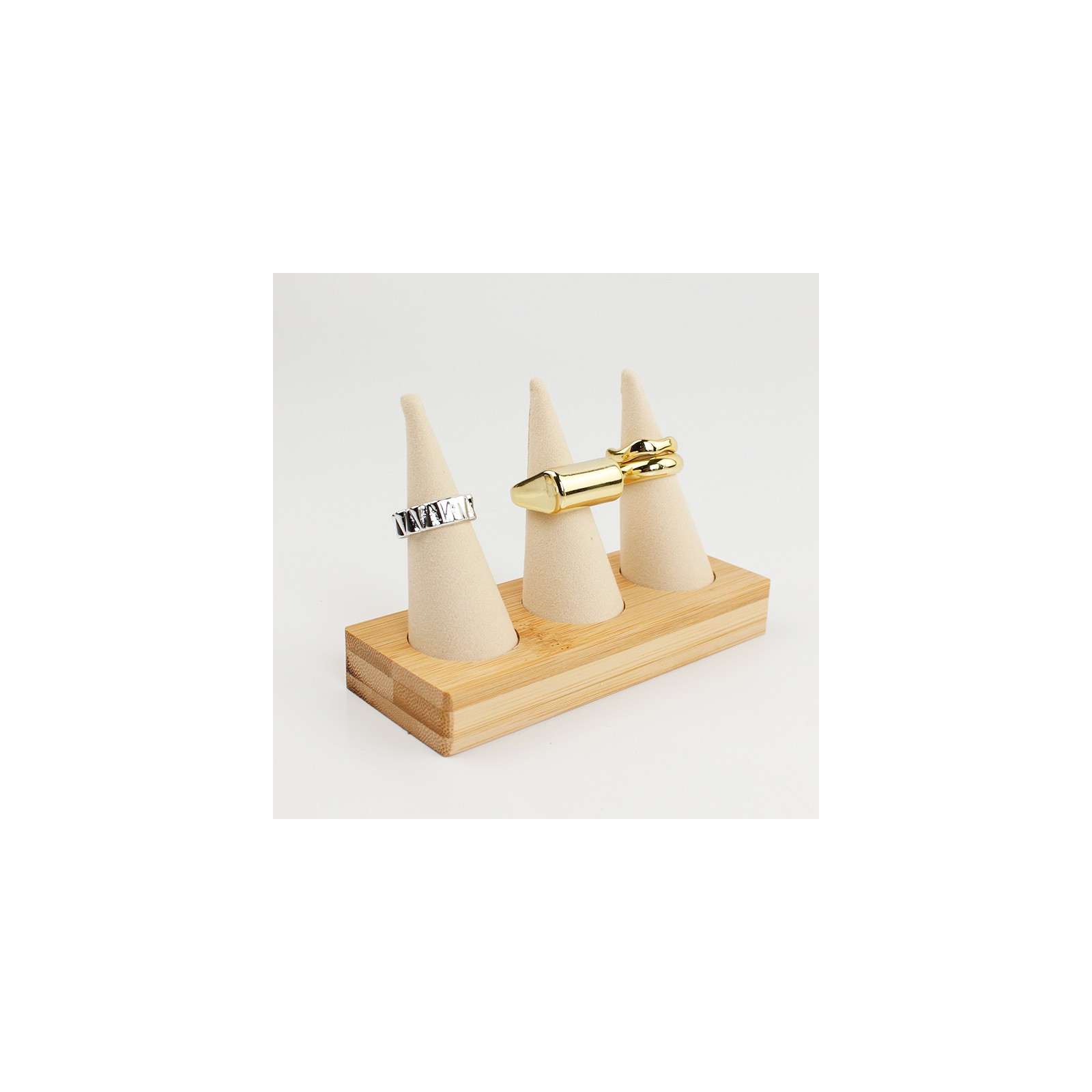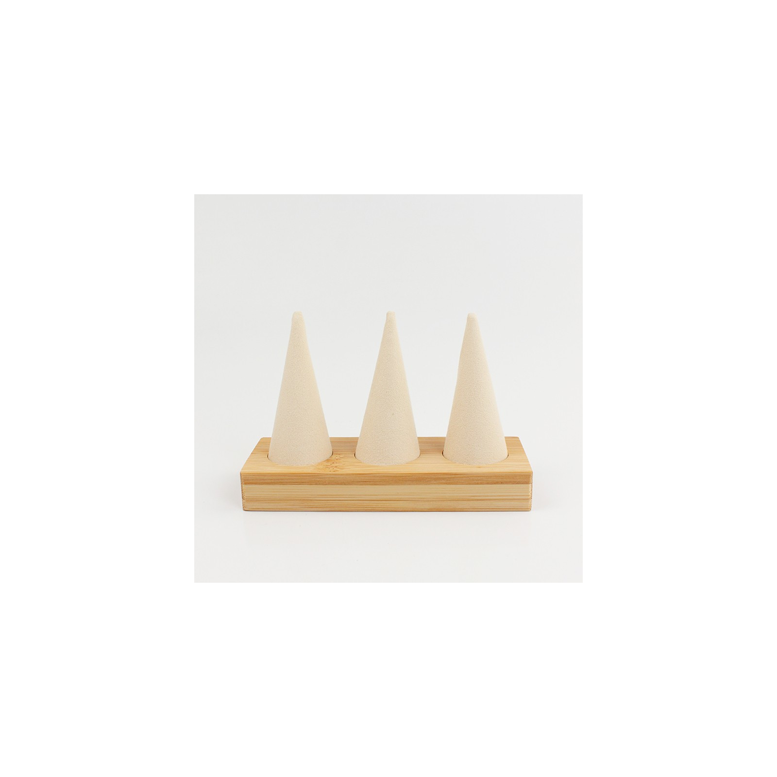 Exhibidor de anillos con base de bambú y conos de tela.