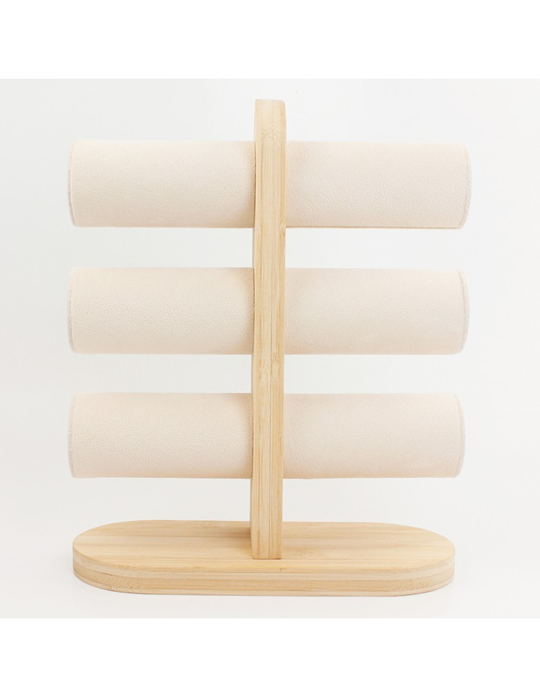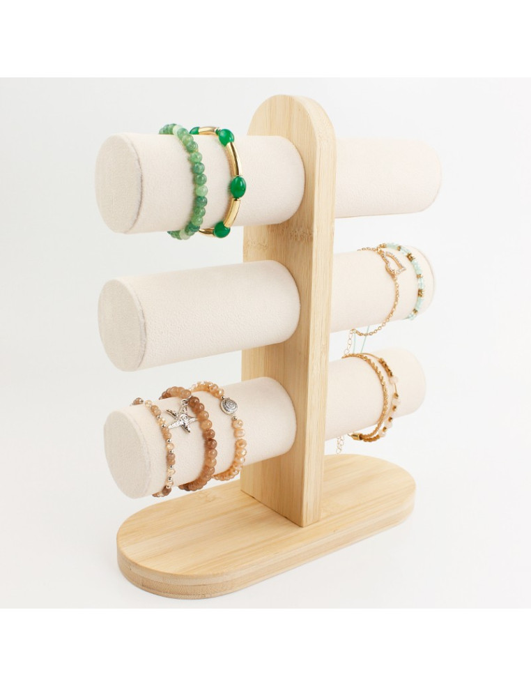 Exhibidor de pulseras de tres niveles con base de bambú y brazos de tela.