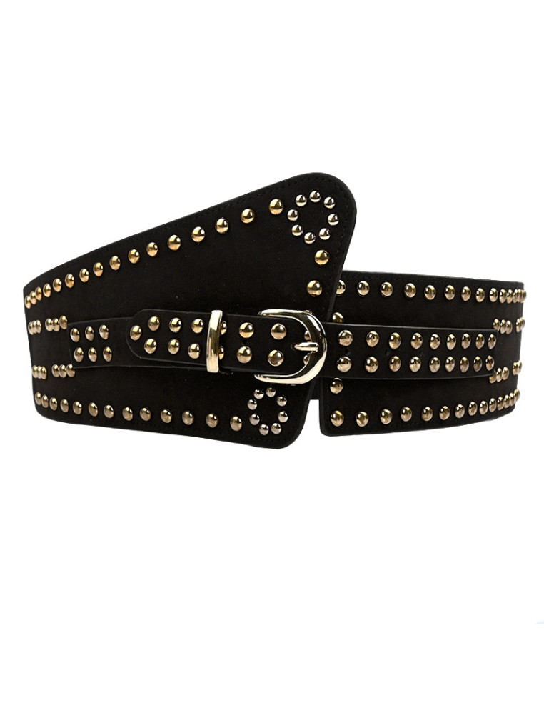 Cinturón faja con banda elástica de PU con múltiples tachas. Extensible hasta 120cm.