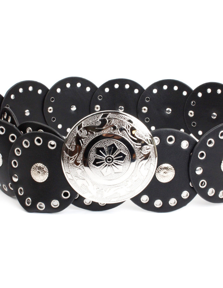 Cinturón faja circular de PU con múltiples ojales y tachas, con hebilla de metal.