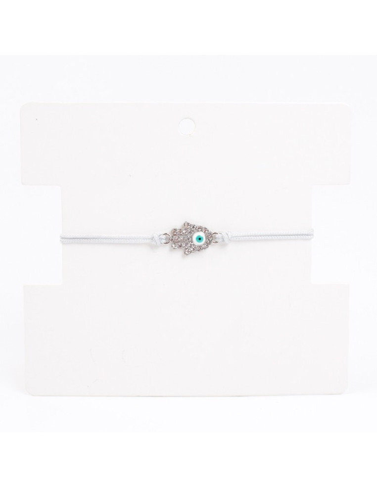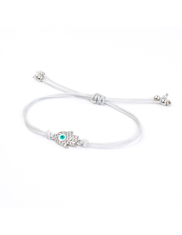 Pulsera de hilo con dije exclusivo de strass en forma de mano, bolitas de CCB en punteras y cierre regulable de macramé.