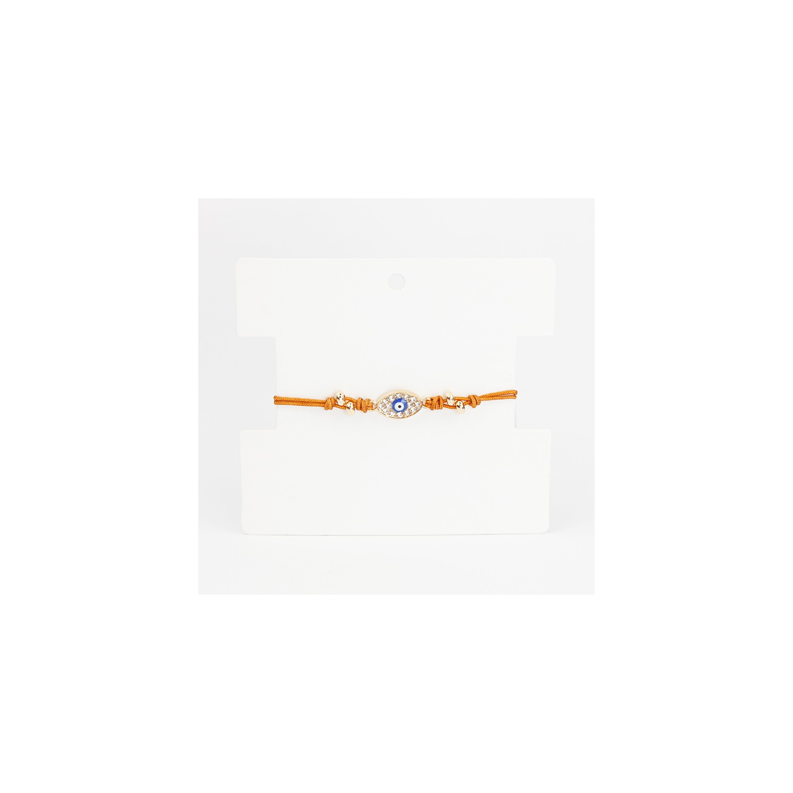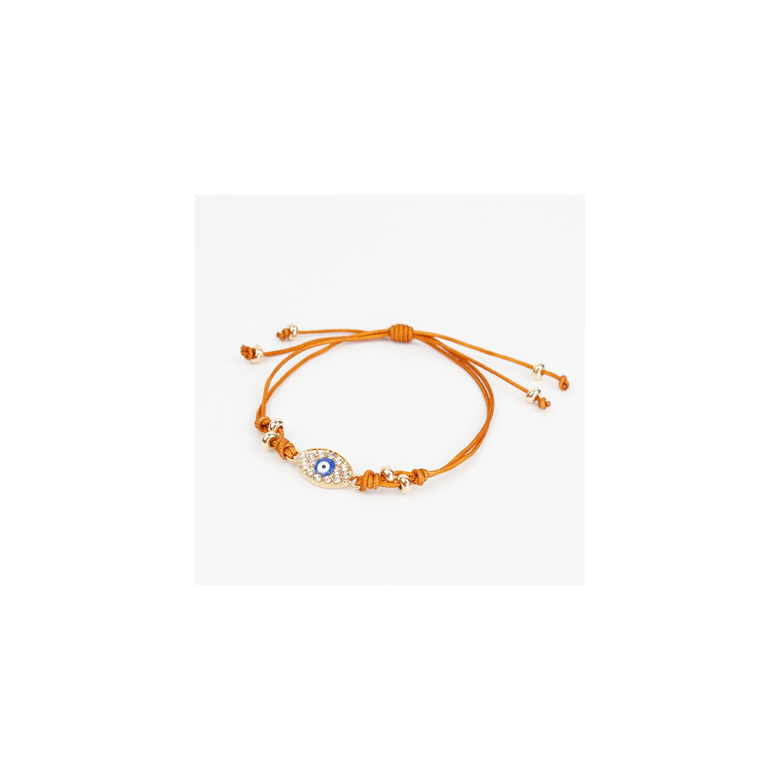 Pulsera de hilo intervenida con dije exclusivo de strass en forma de ojo, piezas pasantes de CCB y largo ajustable de macramé.