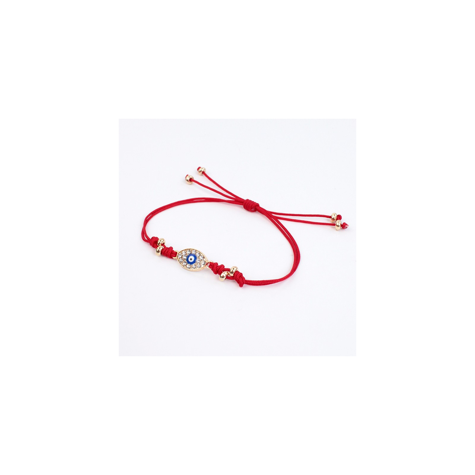Pulsera de hilo intervenida con dije exclusivo de strass en forma de ojo, piezas pasantes de CCB y largo ajustable de macramé.