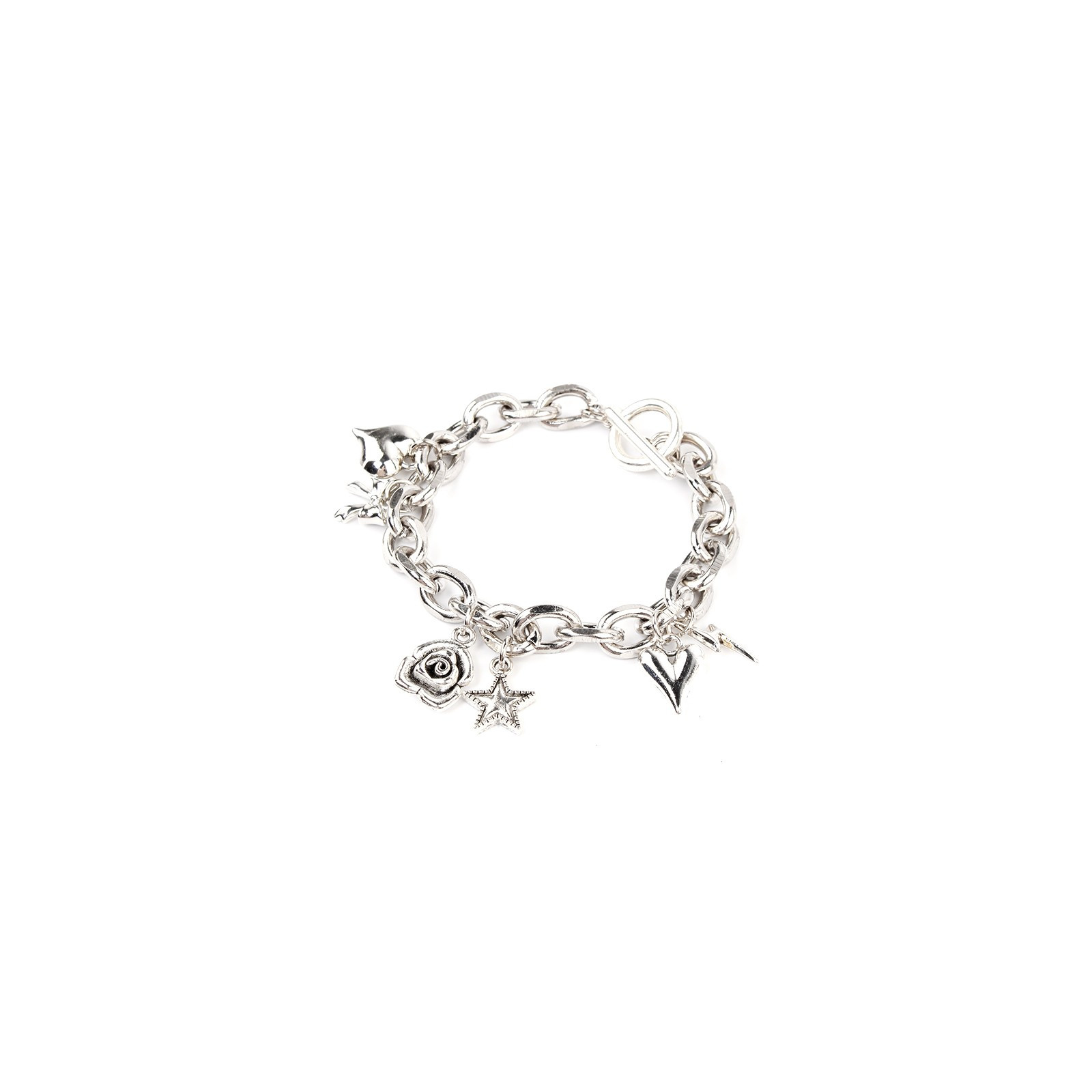 Pulsera trendy de cadena diferenciada con múltiples dijes exclusivos níquel y cierre marinero.