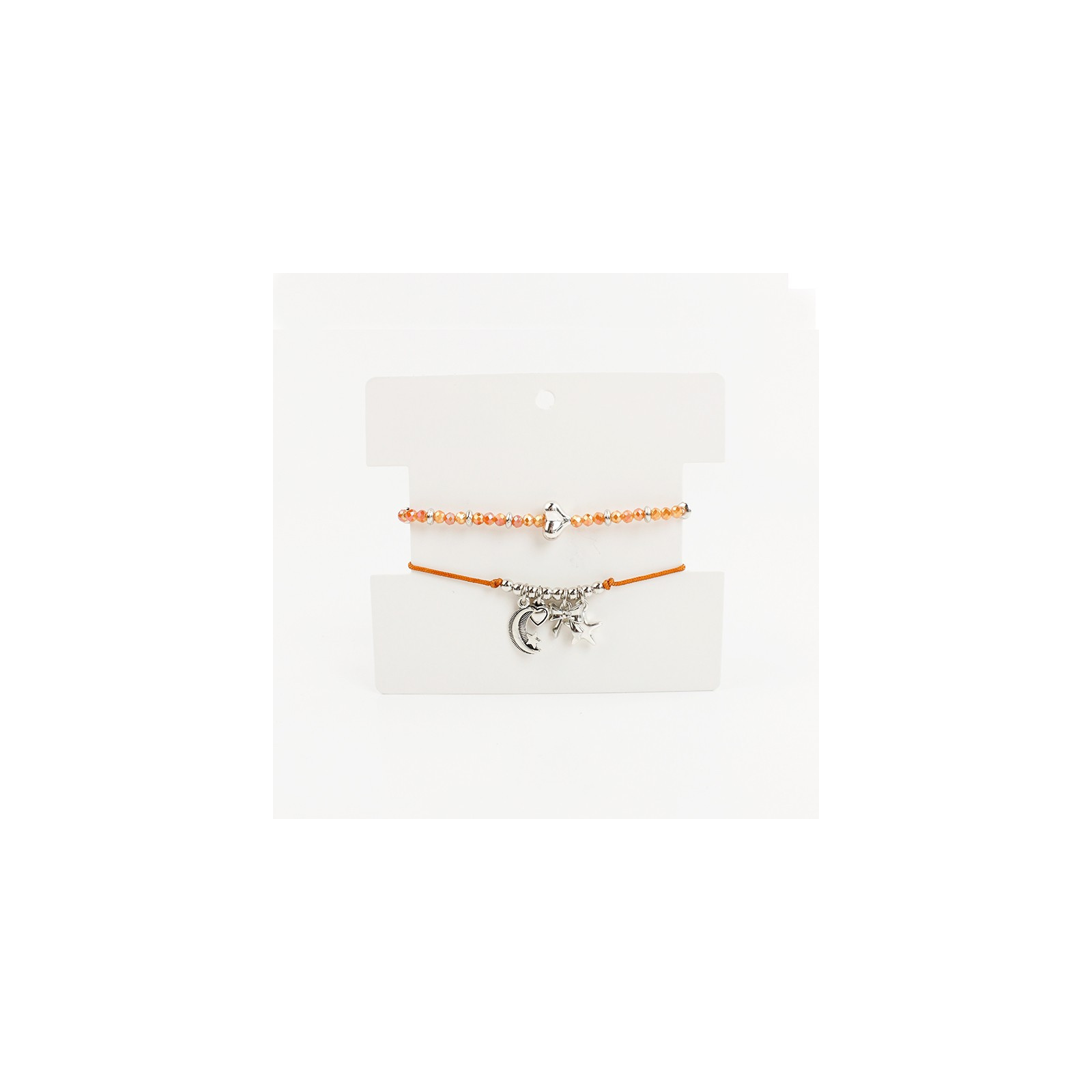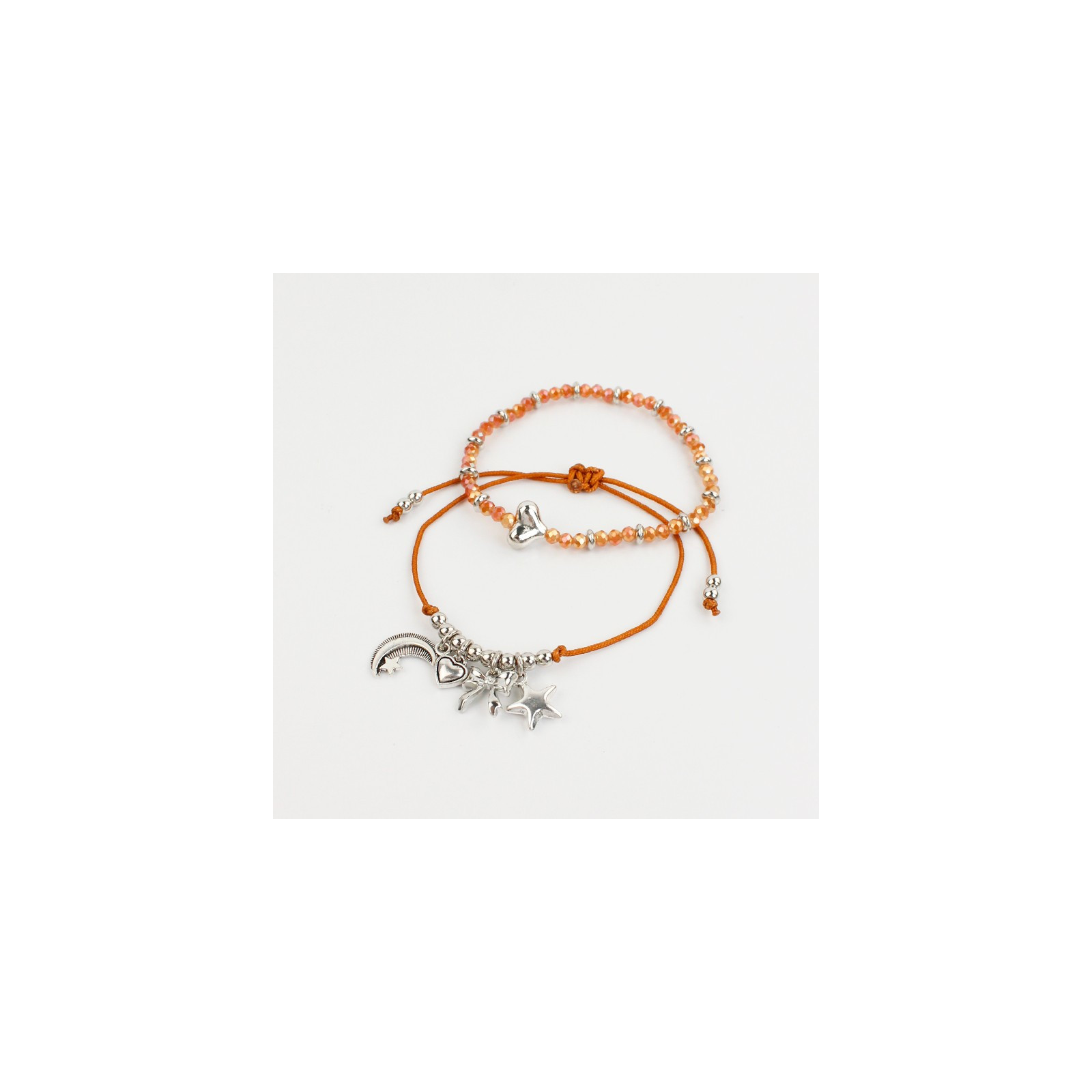 Set de dos pulseras, una de hilo con dijes exclusivos de fundición, otra de rocas de cristal combinadas con separadores de CCB níquel y dije pasante con forma de corazón.