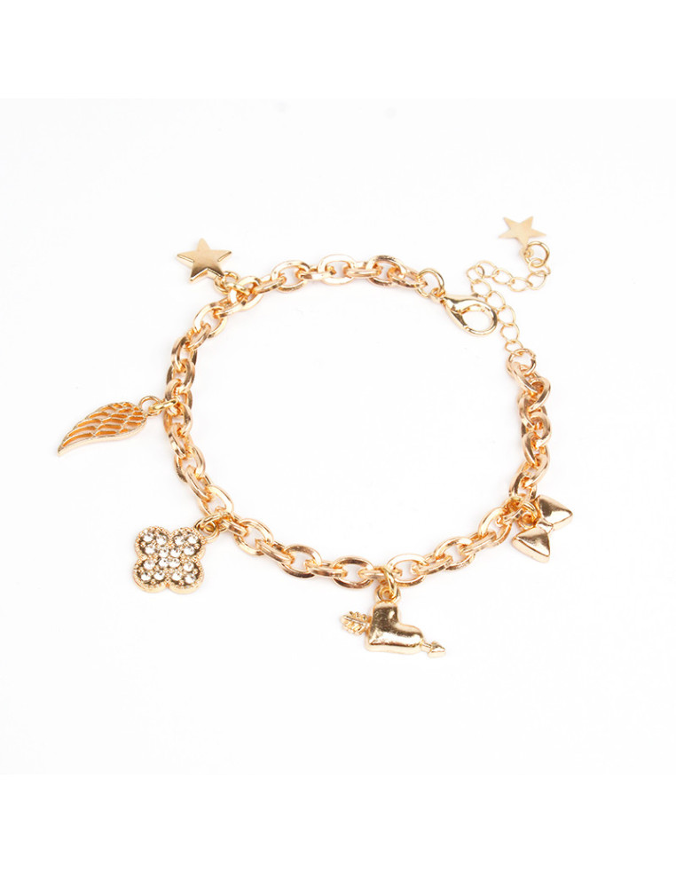 Pulsera multicharms de cadenas, con dijes de fundición y strass. Medidas: 17cm de largo, ajustable con cadena de enganche de 4cm.