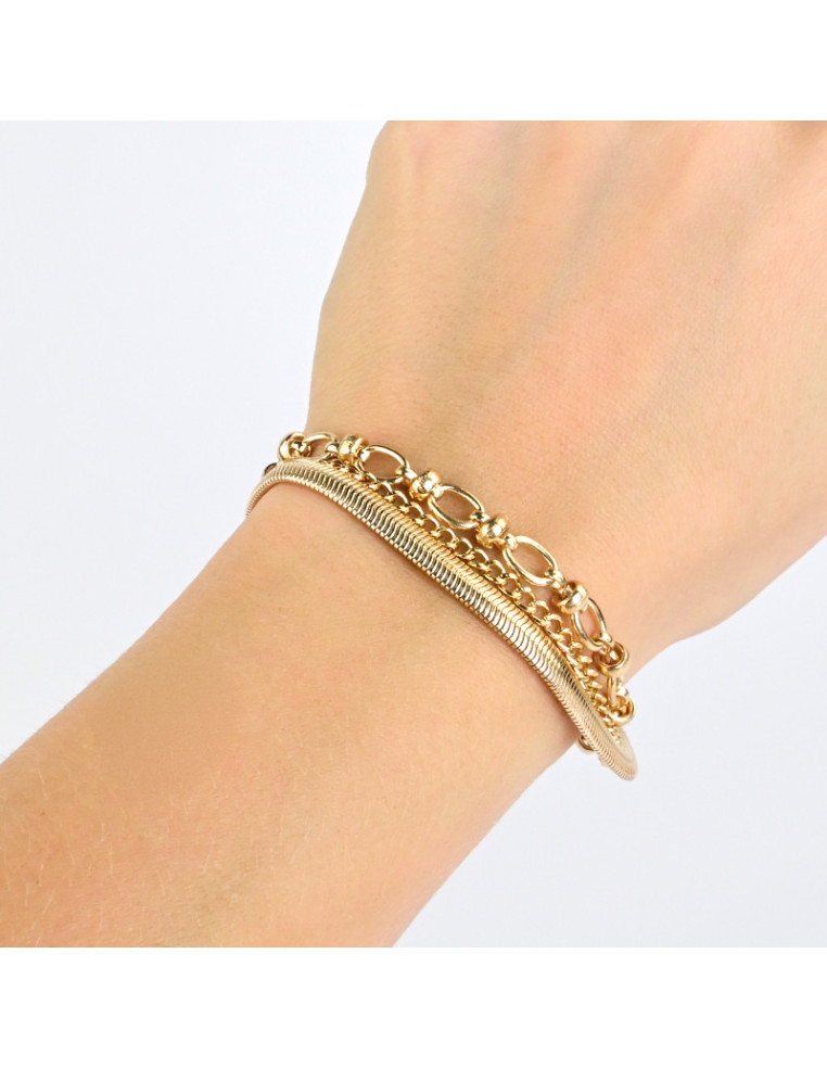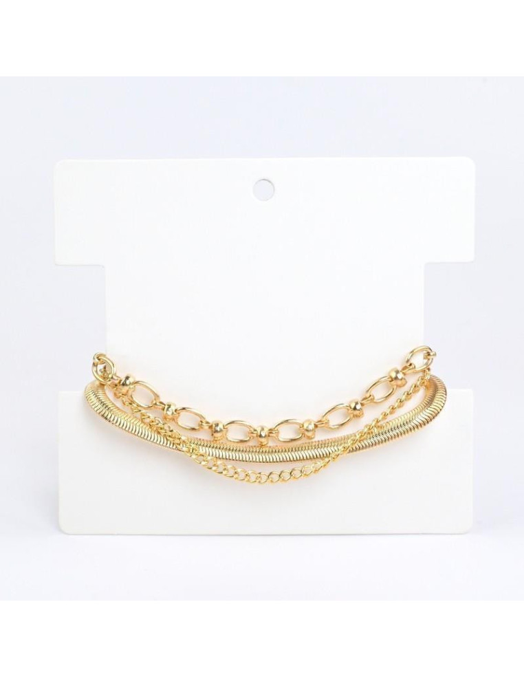 Pulsera de triple cadenas doradas de distintos diseños. Medida: 17cm de largo, ajustable con cadena de enganche de 4cm.