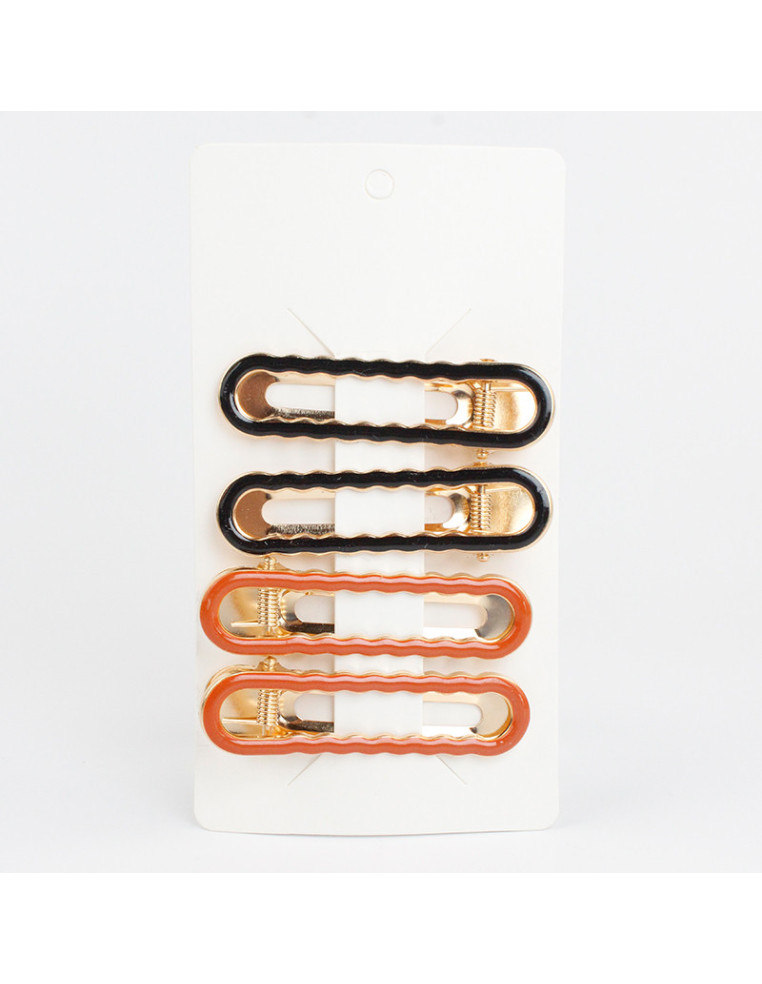 Set de cuatro hebillas de metal doradas pintadas a mano para pelo con forma oval.