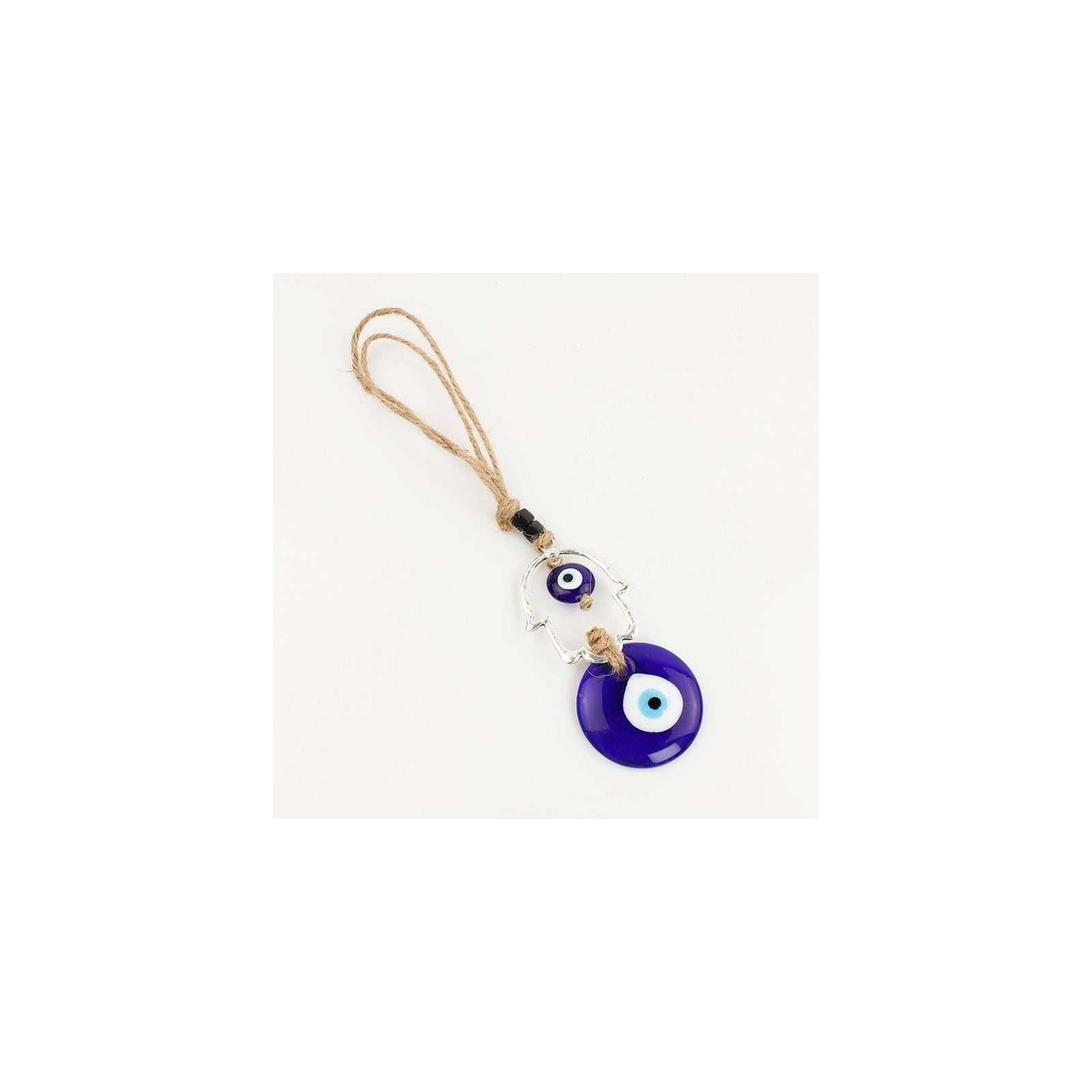 Home line de cordón de yute con piezas exclusivas de vidrio con forma de ojo turco y dije exclusivo de mano hamsa.