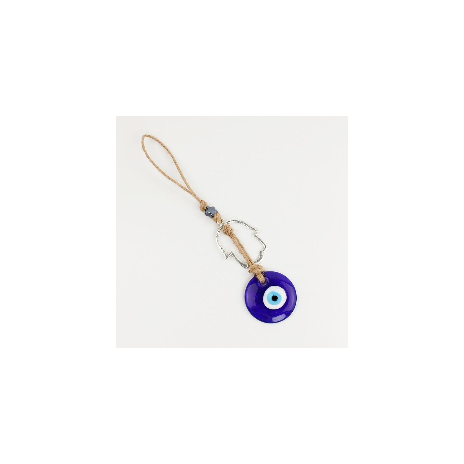 Home line de cordón de yute con piezas exclusivas de vidrio con forma de ojo turco y dije exclusivo de mano hamsa.