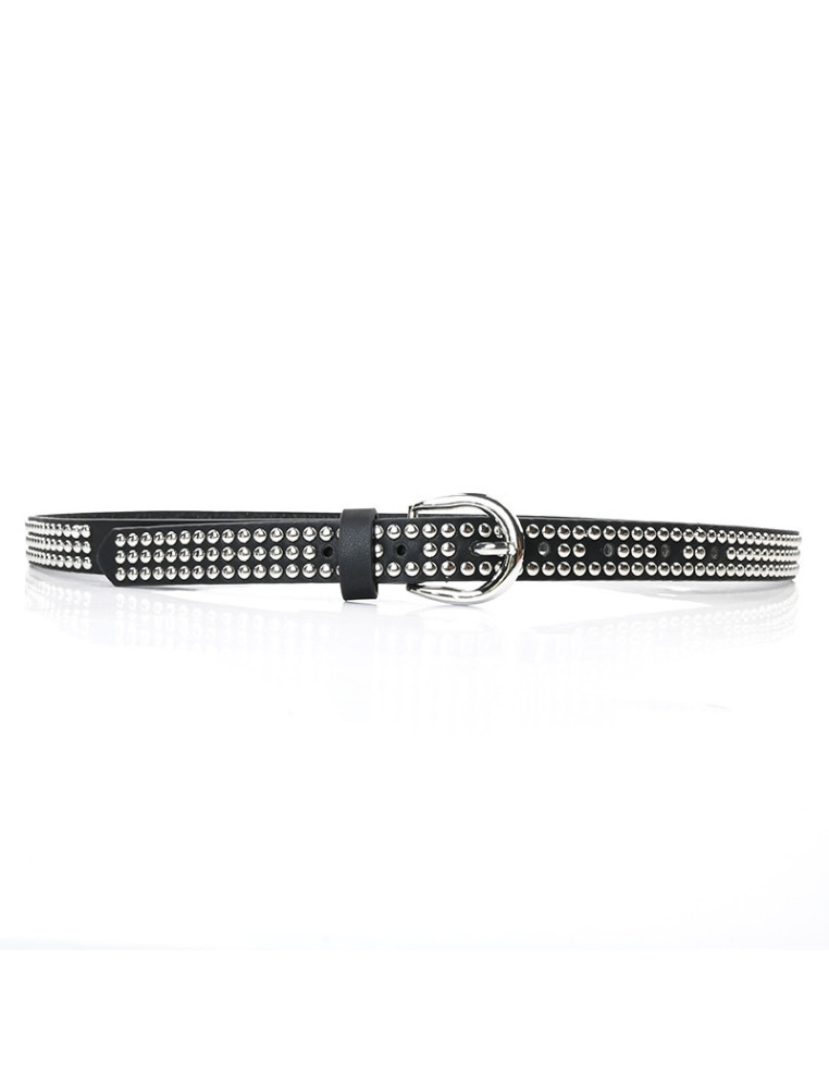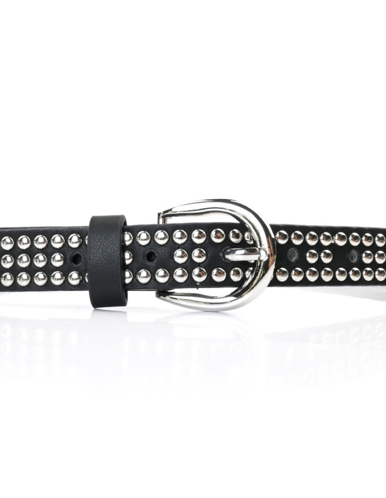 Cinturón de PU con hebilla níquel y múltiples tachas.