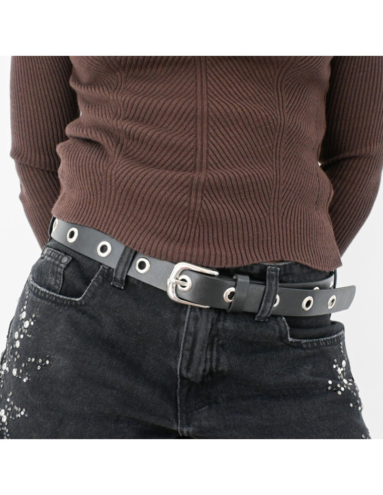 Cinturón importado de PU con ribetes, tachas y hebilla níquel. Medidas: 110 x 2,5m aprox.