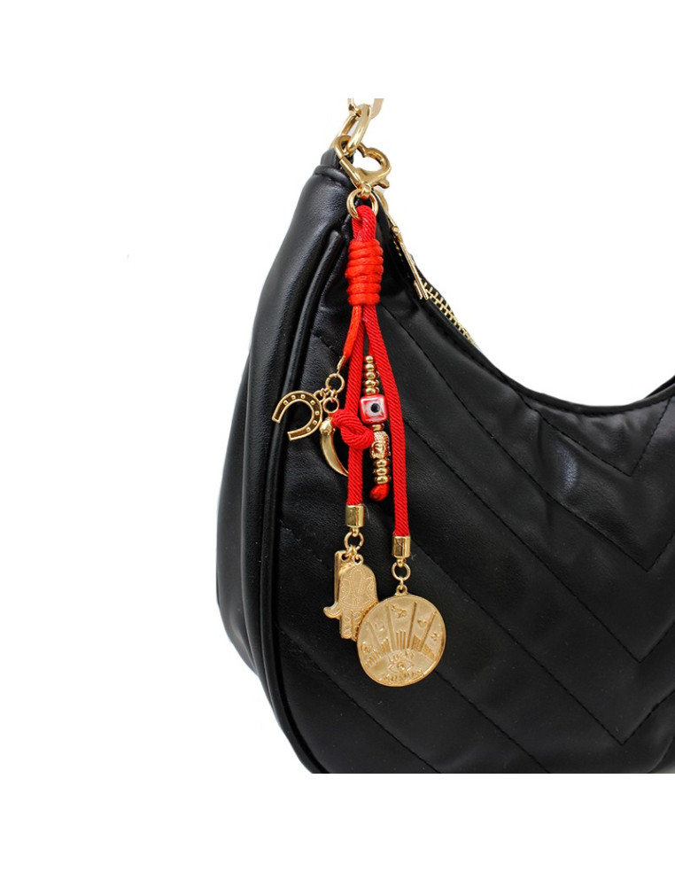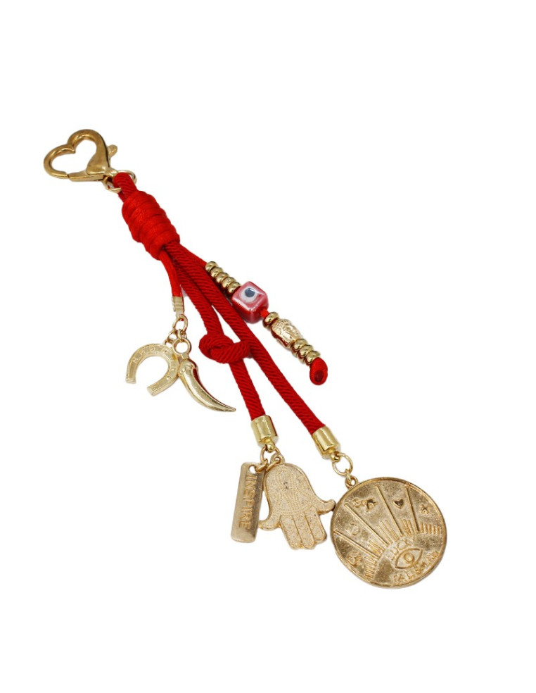 Llavero de cordón con dijes exclusivos dorados.