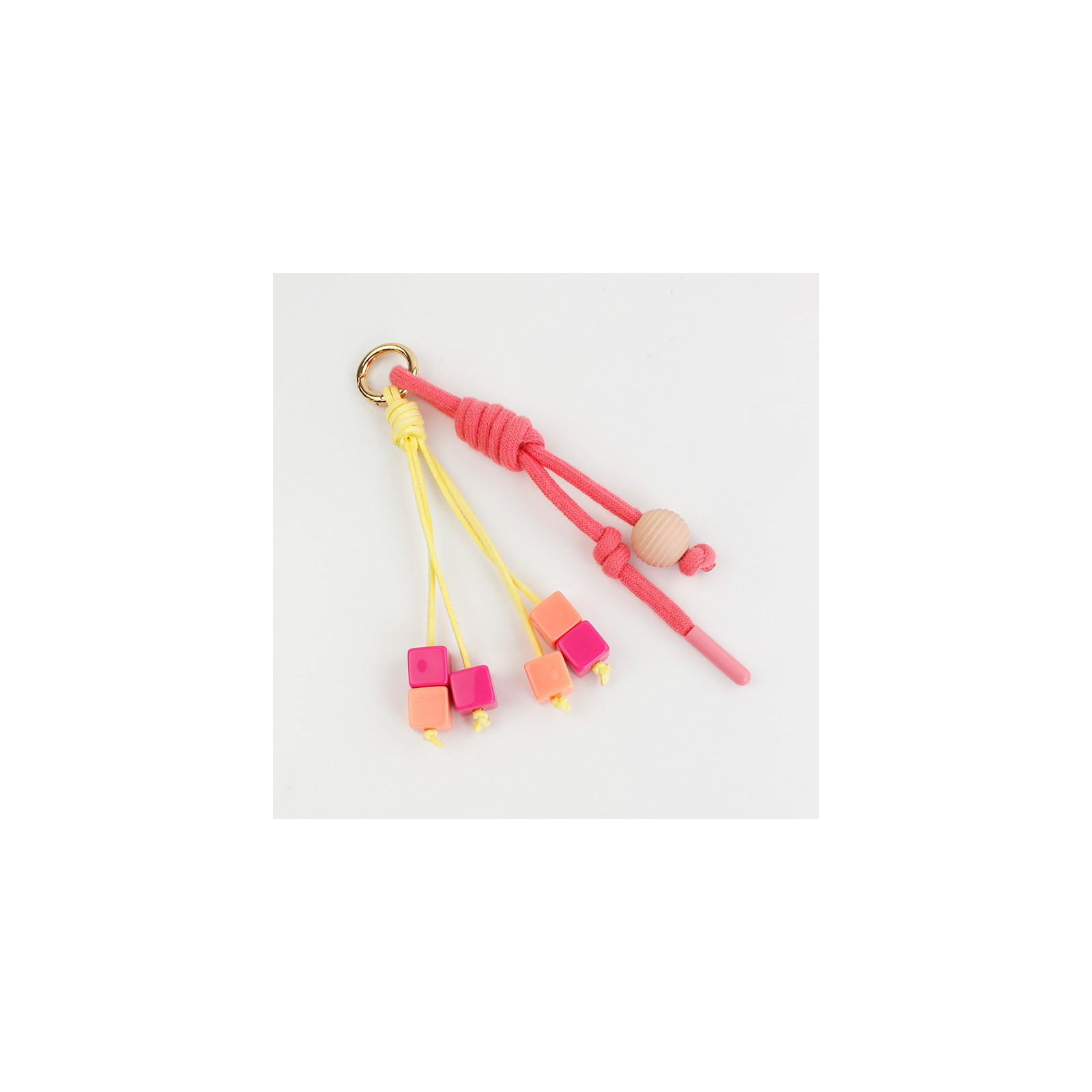 Llavero y bagcharms de cordón diferenciado, combinado con lazos de gamuza y piezas pasantes exclusivas de acrílico.