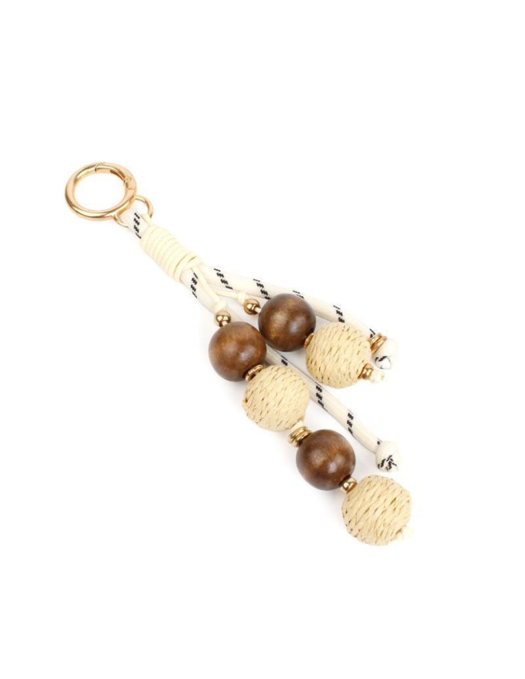 Llavero y bagcharms de cordón, con piezas de madera y bolitas de yute.