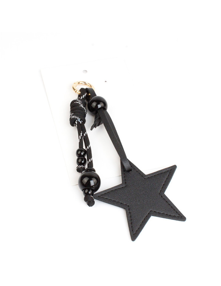Llavero y bag charms de cordón intervenido con piezas de acrílico y pieza de PU con forma de estrella.