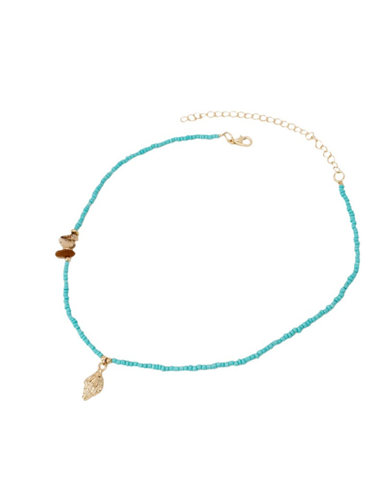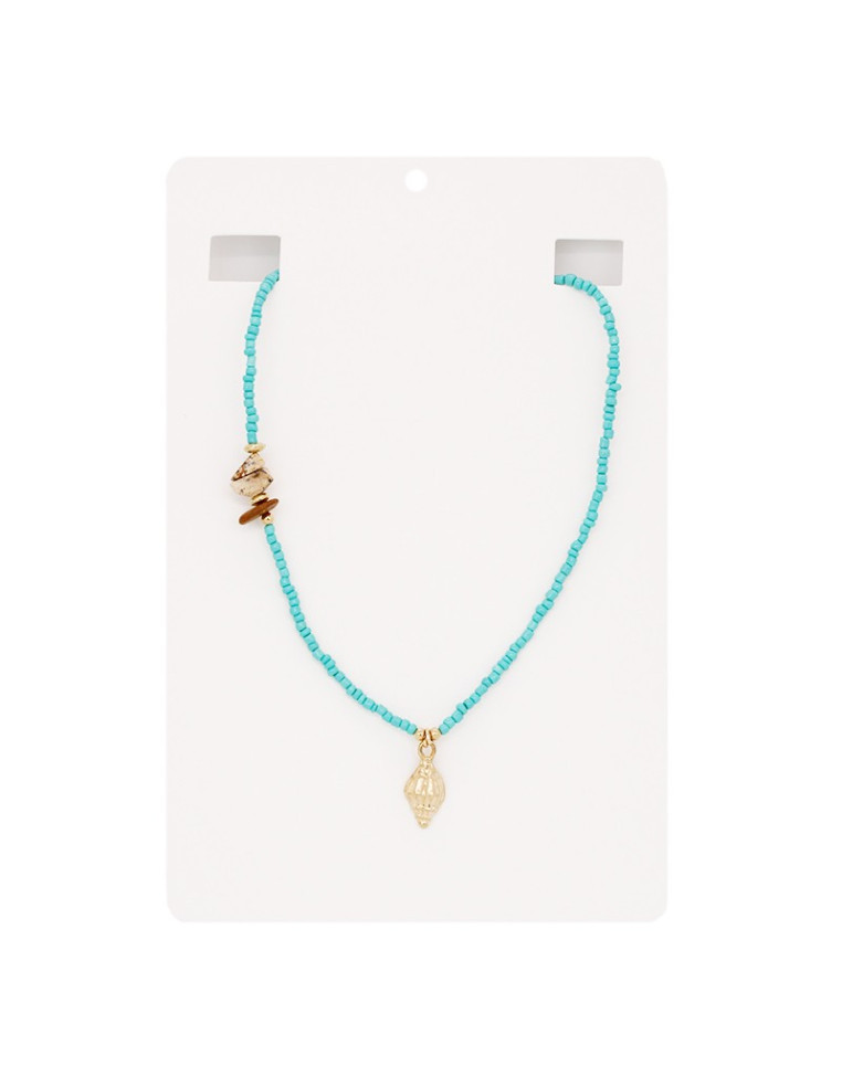 Collar corto de mostacillas con con escallas naturales y dijes exclusivos dorados.