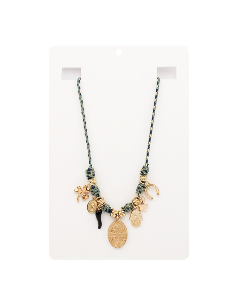 Collar corto de hilo intervenido con múltiples dijes exclusivos dorados.
