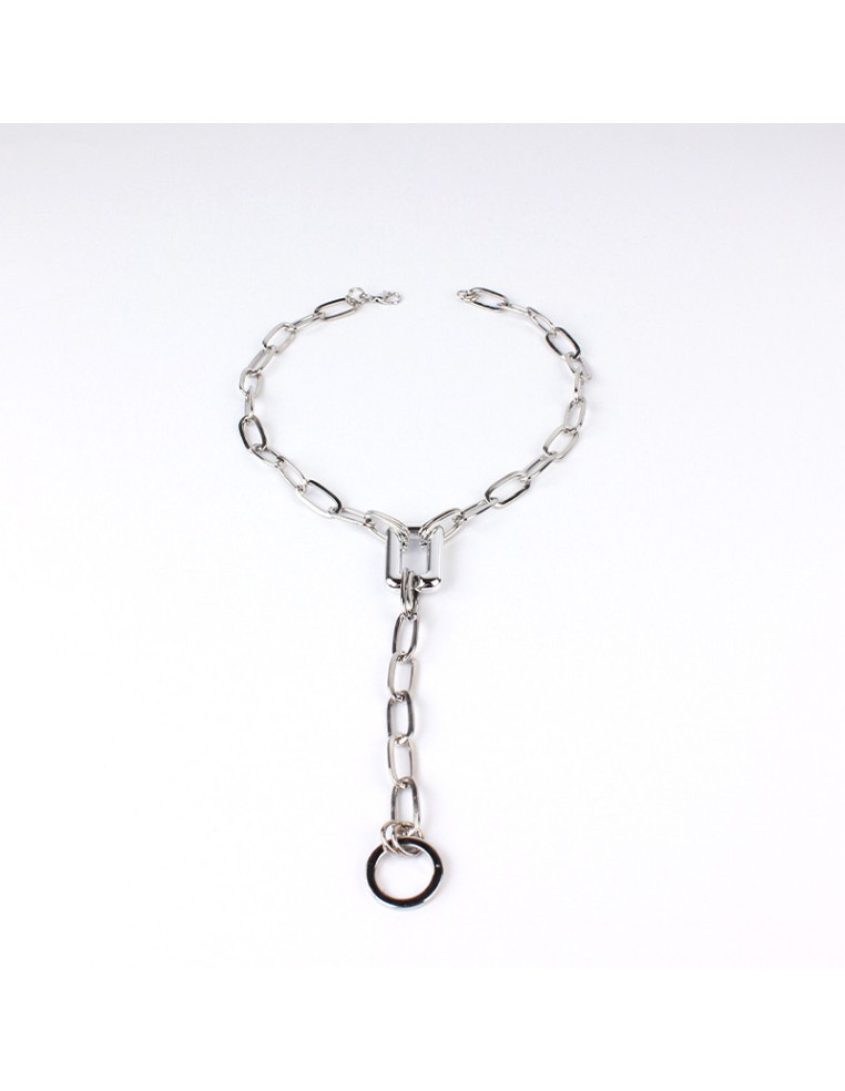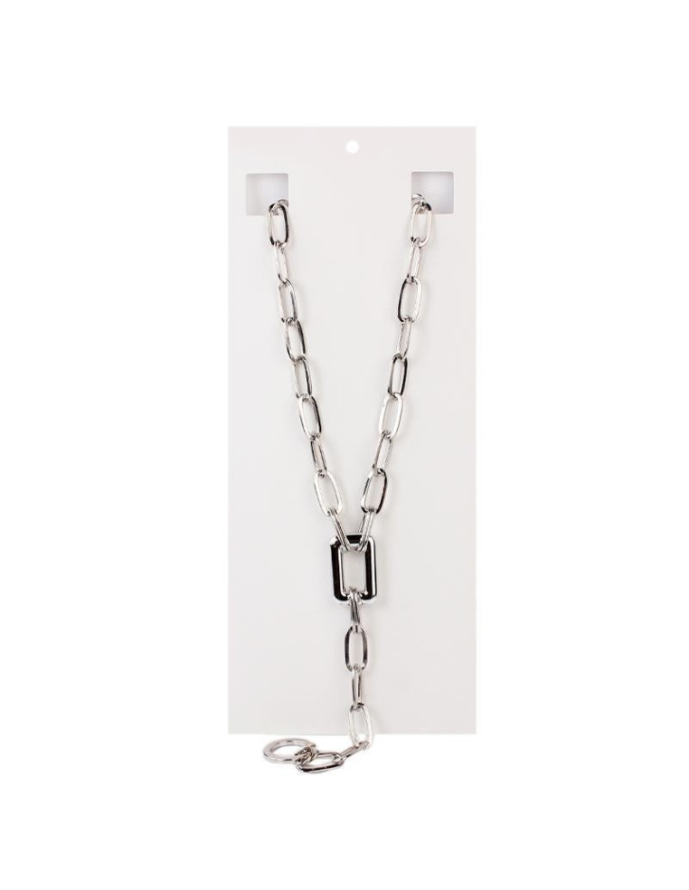 Collar largo de cadena diferenciada intervenido con eslabón rectangular y caída adicional de cadena.