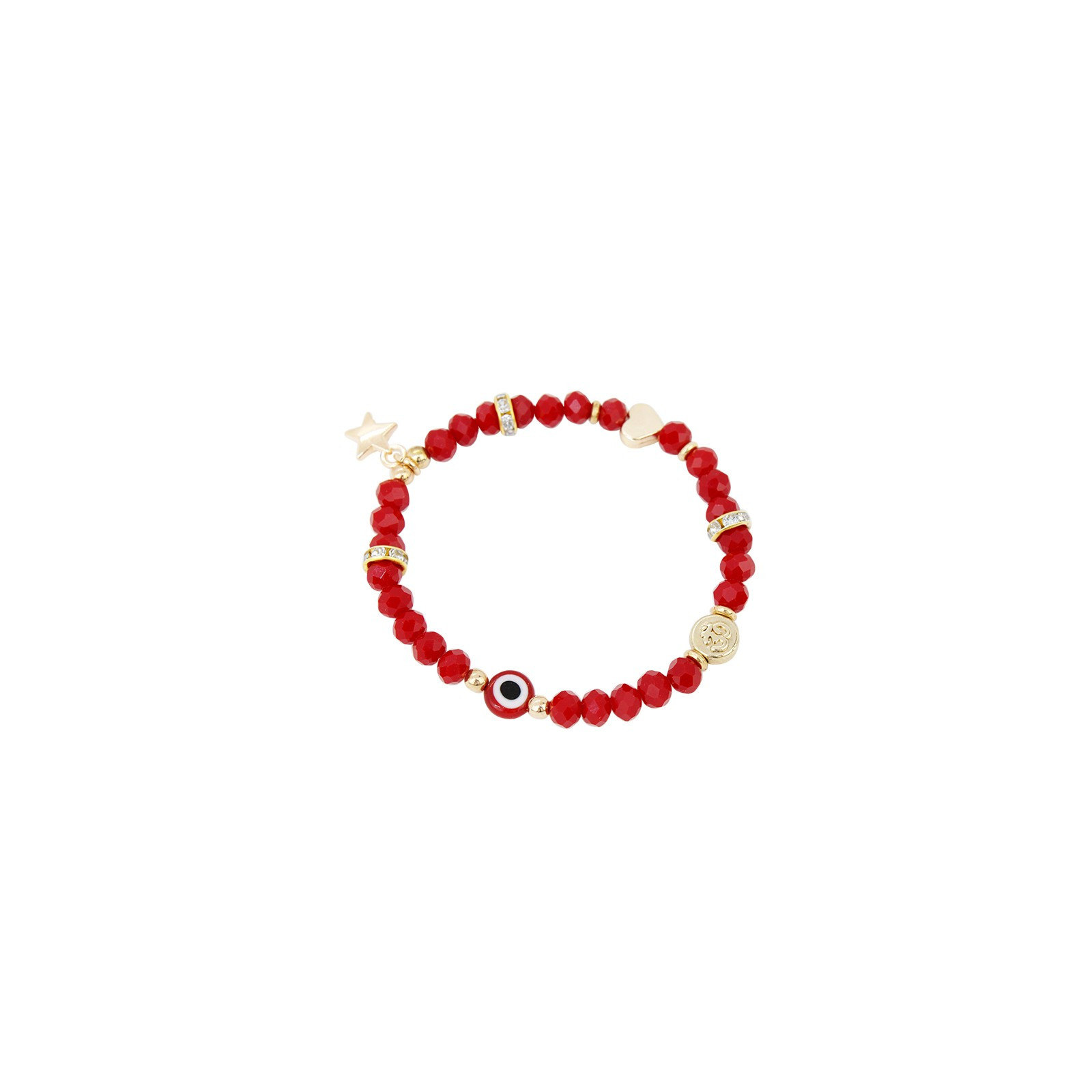 Pulsera elástica de rocas de cristal con ojo de vidrio y dijes exclusivos dorados.