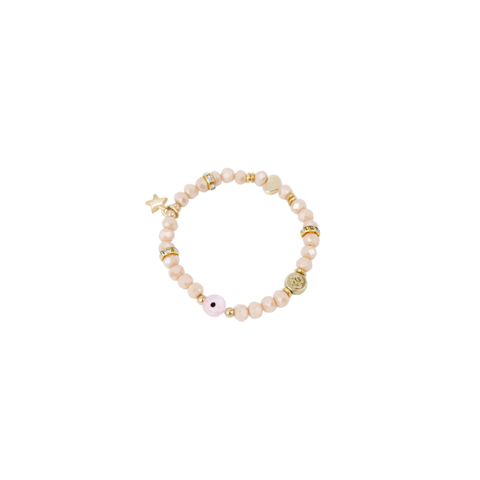 Pulsera elástica de rocas de cristal con ojo de vidrio y dijes exclusivos dorados.