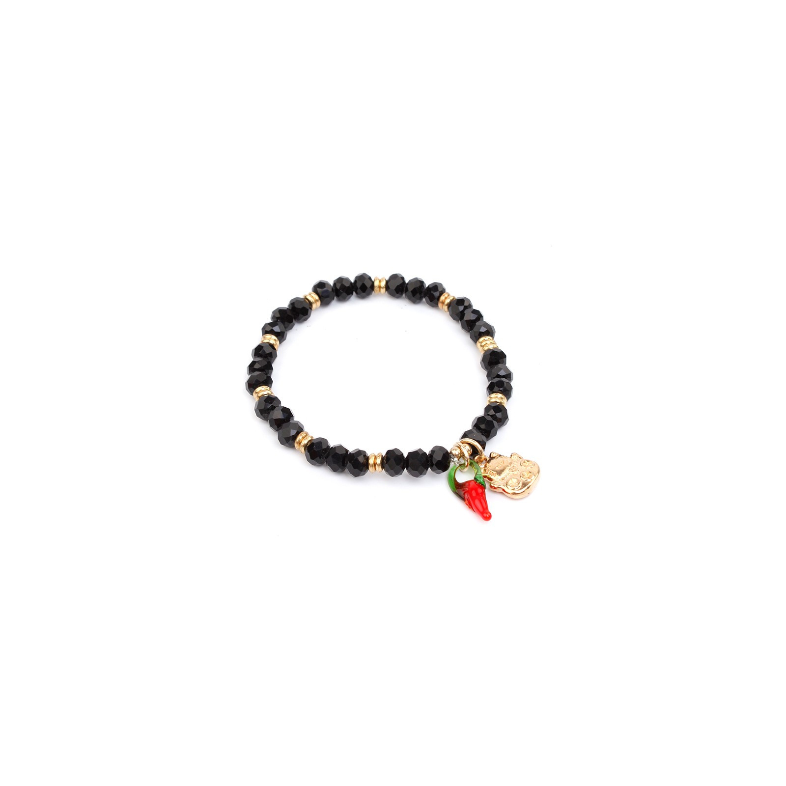 Pulsera elástica de rocas de cristal con dije exclusivo dorado y ají de vidrio.